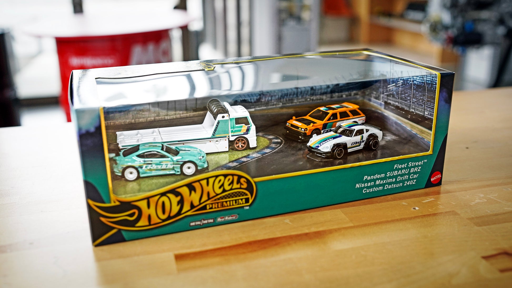 This Hot Wheels Premium collector set includes a diorama featuring the iconic Datsun 240Z, Nissan Maxima Drift Car, and Subaru BRZ, providing a comprehensive display of these rare vehicles.