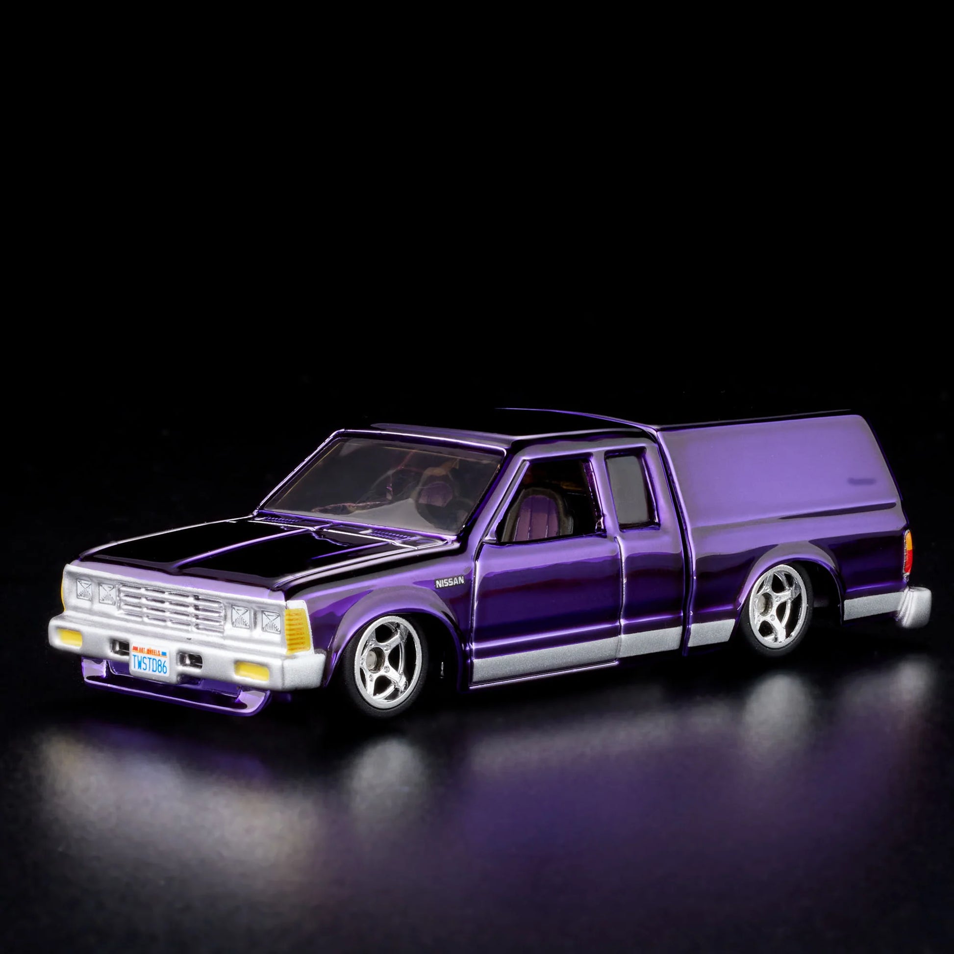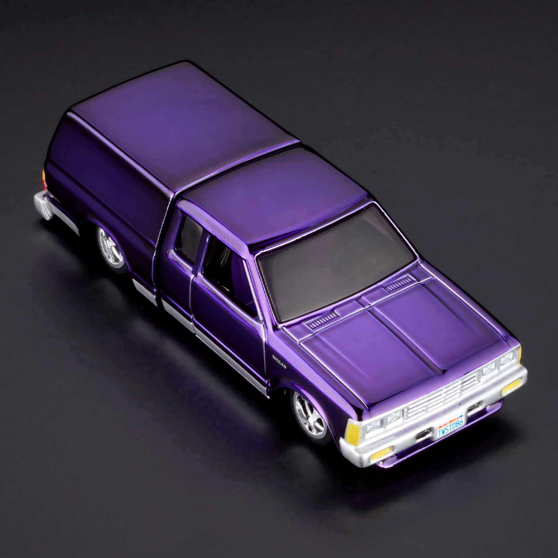 The 1986 Nissan 720 King Cab with posable “dancing” bed, speakers, and video display, takes fun to the extreme. Our RLC exclusive version is its own party with dark purple Spectraflame paint, a Masters of the Universe graphic on the screen, Twisted graphic on the rear window, and Real Riders 5-spoke modern wheels.